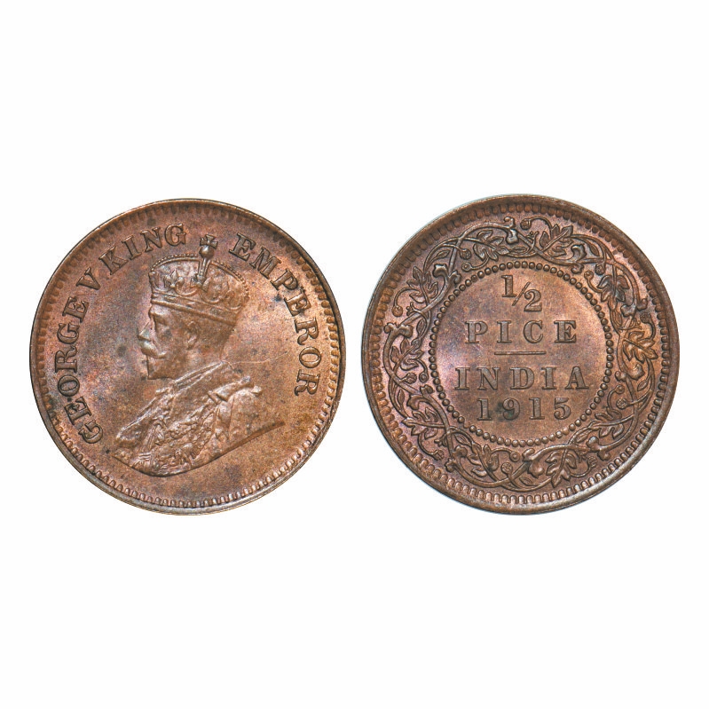 George V, Bronze, 1/2 Pice, 1915, Calcutta mint, No mint mark, Ghost on Rev. GK 1201. Uncirculated. Very scarce.