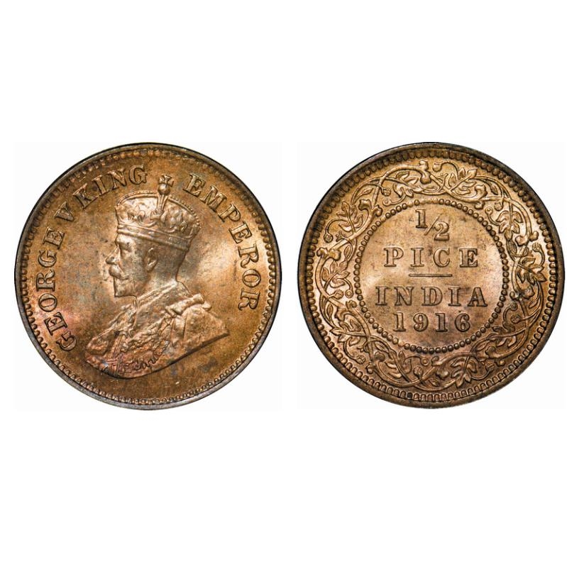 George V, Bronze, 1/2 Pice, 1916, Calcutta Mint, No mint mark. GK 1202. Brilliant Uncirculated. Very Scarce.