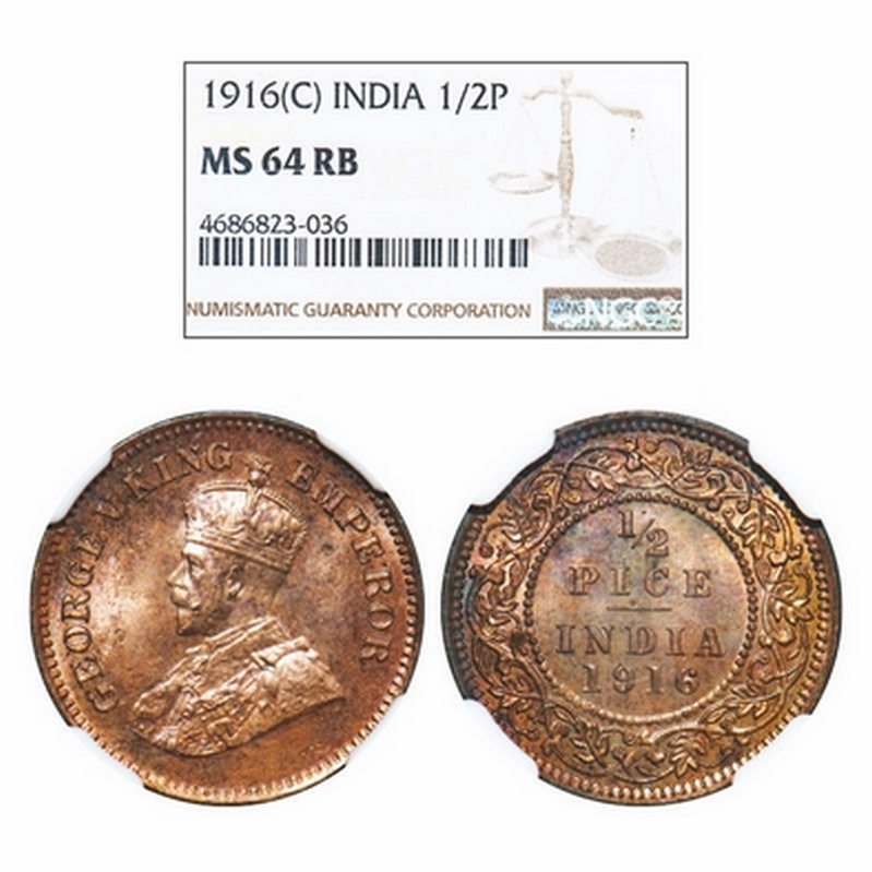 George V, Bronze, 1/2 Pice, 1916, Calcutta Mint, No mint mark. GK 1202. NGC Slabbed MS 64 RB. Rare.