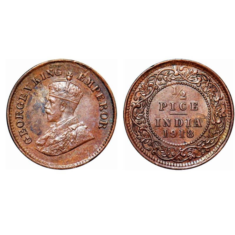 George V, Bronze, 1/2 Pice, 1918, Calcutta Mint, No mint mark, Ghost on Rev. GK 1204. Uncirculated. Very Scarce.