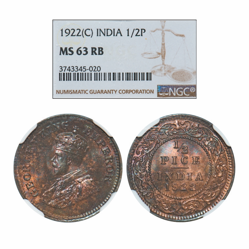 George V, Bronze, 1/2 Pice, 1922, Calcutta Mint, No mint mark. GK 1208. NGC Slabbed MS 63 RB. Very Scarce.