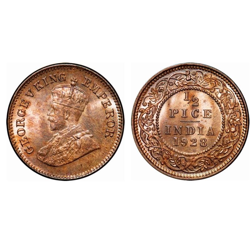 George V, Bronze, 1/2 Pice, 1928, Calcutta Mint, No mint mark. GK 1214. Brilliant Uncirculated. Very Scarce.