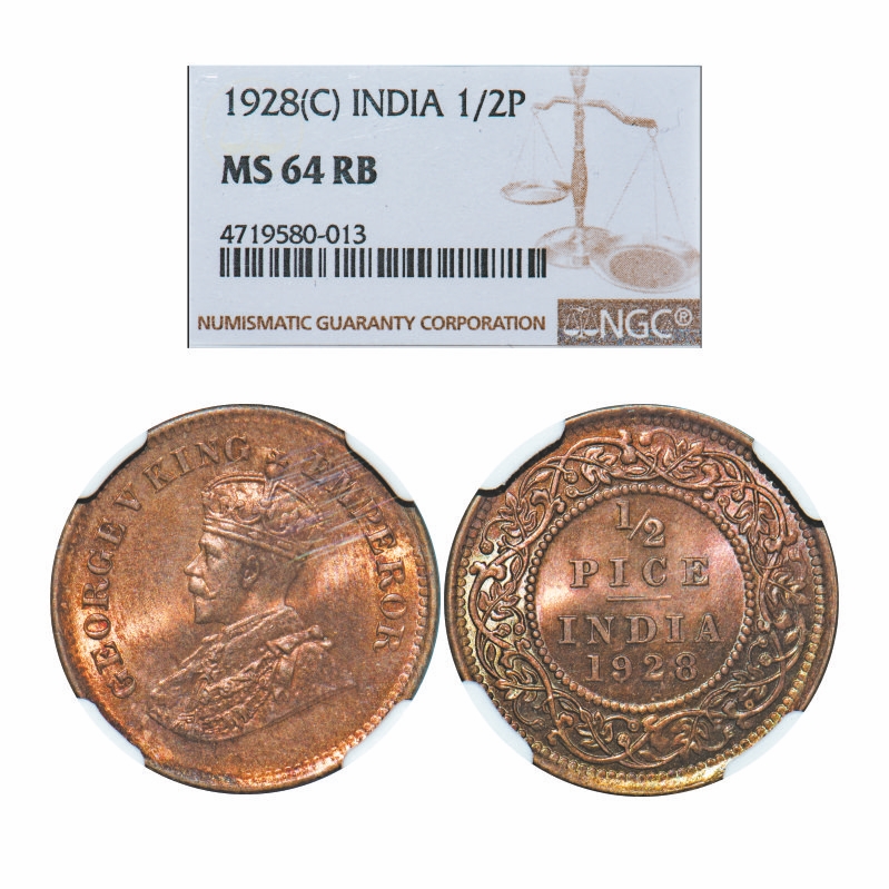 George V, Bronze, 1/2 Pice, 1928, Calcutta Mint, No mint mmark. GK 1214. NGC Slabbed MS 64 RB. Rare.