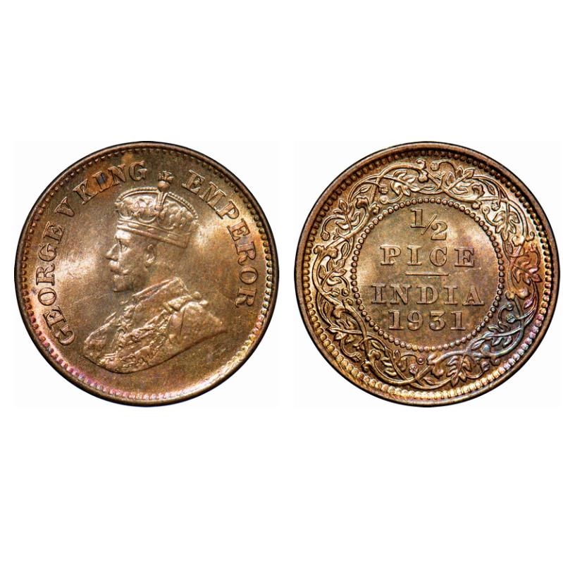 George V, Bronze, 1/2 Pice, 1931, Calcutta Mint, No mint mark. GK 1217. Brilliant Uncirculated, Rainbow Toned. Very Scarce.
