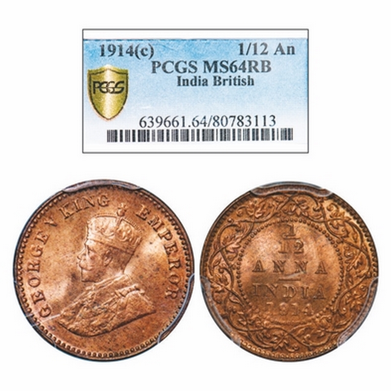 George V, Bronze, 1/12 Anna, 1914, Calcutta Mint, No dot. GK 1225. PCGS Slabbed MS 64 RB. Rare.