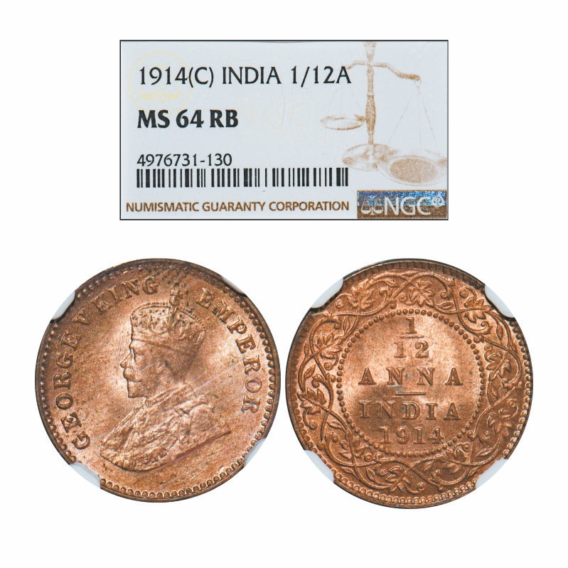 George V, Bronze, 1/12 Anna, 1914, Calcutta Mint, No dot. GK 1225. NGC Slabbed MS 64 RB. Rare.