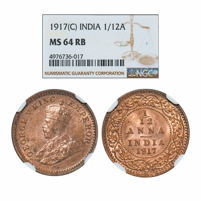 George V, Bronze, 1/12 Anna, 1917, Calcutta Mint, No dot. GK 1228. NGC Slabbed MS 64 RB. Rare.