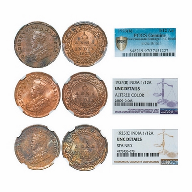 George V, Bronze, 1/12 Annna, (3 slabs), 1) 1923, Bombay Mint, Dot, 2) 1924, Bombay Mint, Dot, 3) 1925, Calcutta Mint, No dot. GK 1233, 1235, 1238. PCGS Slabbed UNC Details, NGC Slabbed UNC Details. Scarce. |