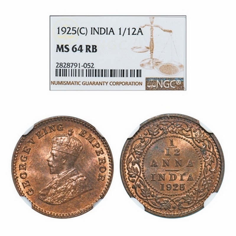 George V, Bronze, 1/12 Anna, 1925, Calcutta Mint, No dot. GK 1238. NGC Slabbed MS 64 RB. Rare.