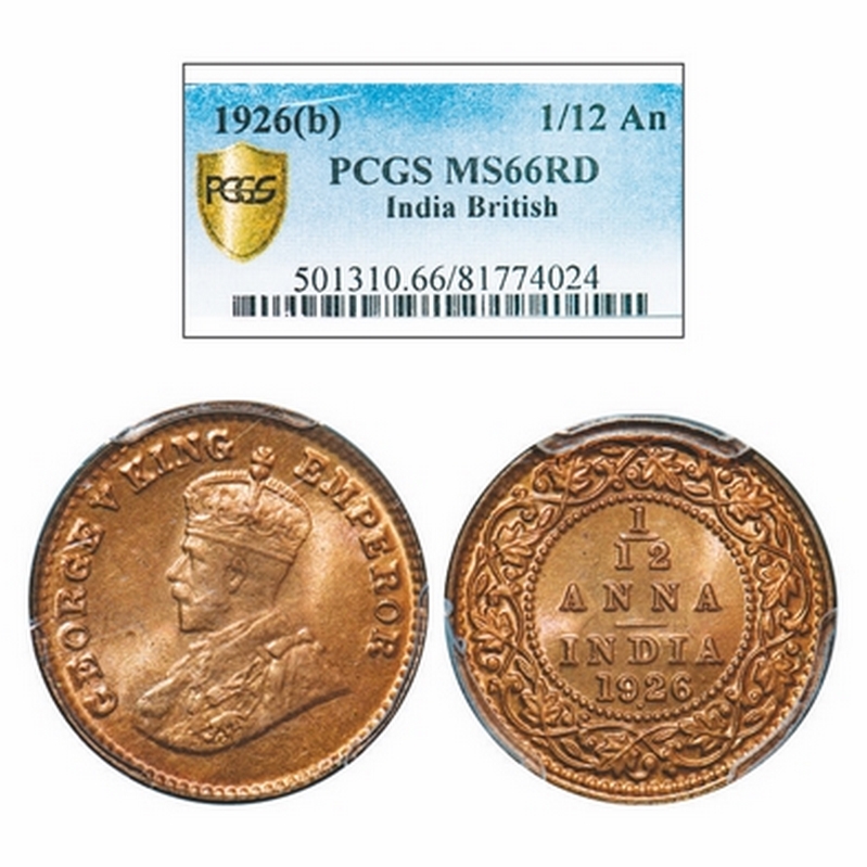 George V, Bronze, 1/12 Anna, 1926, Bombay Mint, Dot. GK 1239. PCGS Slabbed MS 66 RD. Rare.