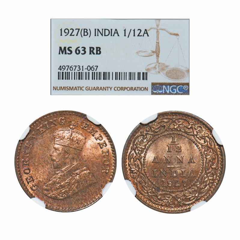 George V, Bronze, 1/12 Anna, 1927, Bombay Mint, Dot. GK 1241. NGC Slabbed MS 63 RB. Very Scarce.