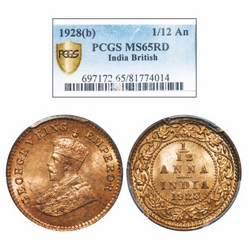 George V, Bronze, 1/12 Anna, 1928, Bombay Mint, Dot. GK 1243. PCGS Slabbed MS 65 RD. Rare.
