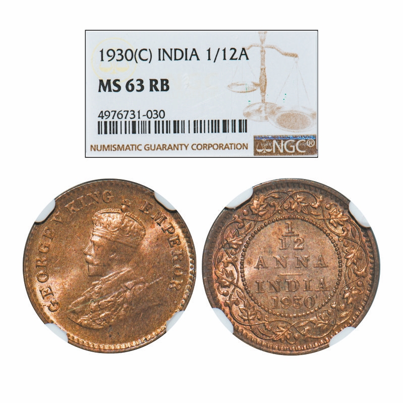 George V, Bronze, 1/12 Anna, 1930, Calcutta Mint, No dot. GK 1246. NGC Slabbed MS 63 RB. Rare.
