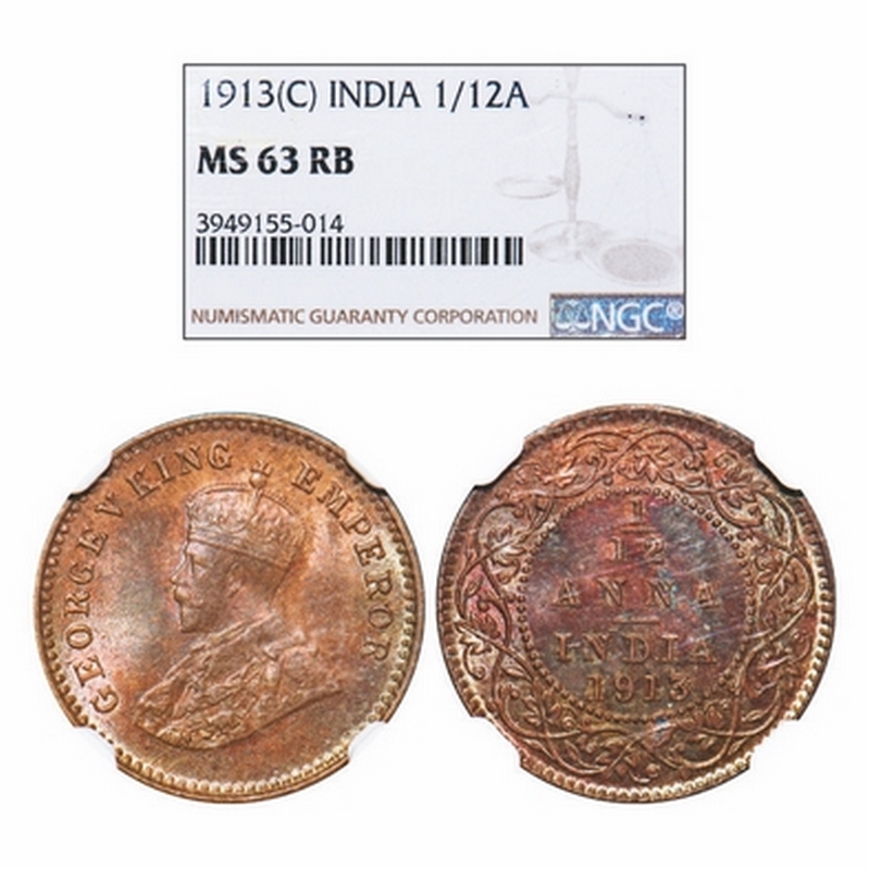 George V, Bronze, 1/12 Anna, 1913, Calcutta Mint, No dot. GK 1224. NGC Slabbed MS 63 RB. Rare.