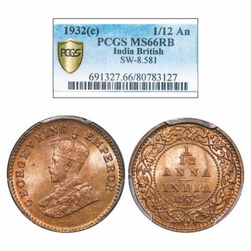 George V, Bronze, 1/12 Anna, 1932, Calcutta Mint, No dot. GK 1248. PCGS Slabbed MS 66 RB. Very Scarce.