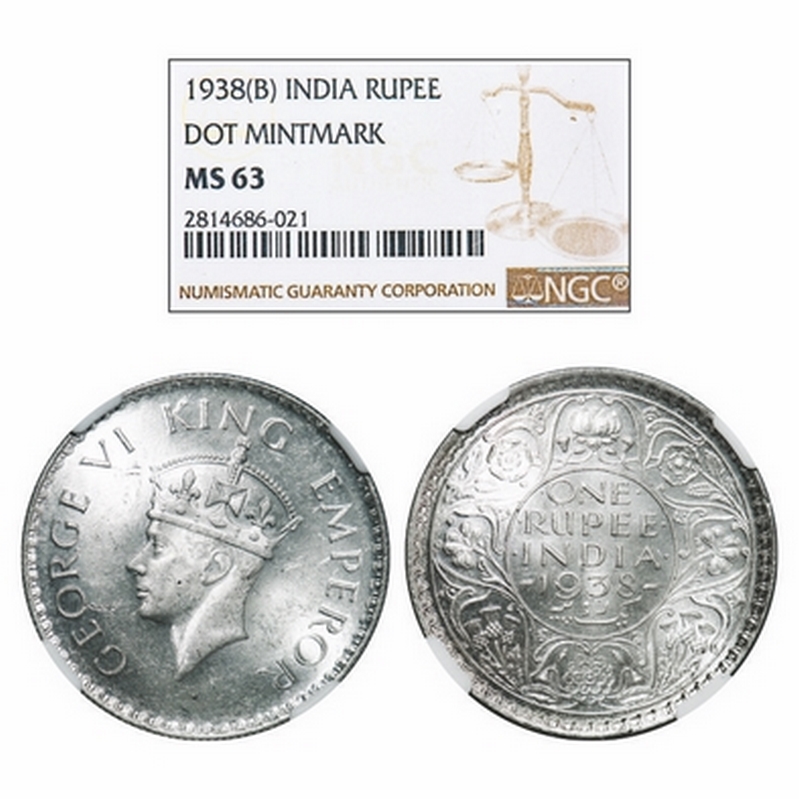 George VI, Silver, Rupee, 1938, Bombay Mint, A/I, Dot, Milled edge. GK 1255. NGC Slabbed MS 63. Rare.