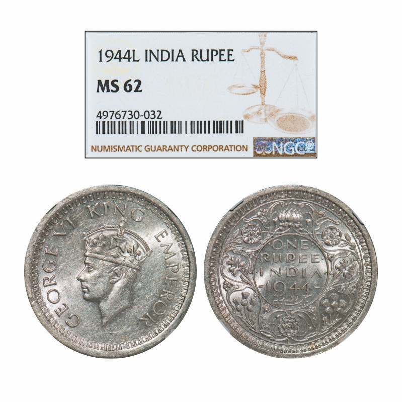 George VI, Half Silver, Rupee, 1944, Lahore Mint, D/II, 'L' raised, Security edge, Thin 'L'. GK 1282. NGC Slabbed MS 62. Very Scarce. |