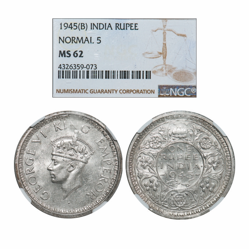George VI, Half Silver, Rupee, 1945, Bombay Mint, D/II, Dot, Security edge, Normal 5. GK 1286. NGC Slabbed MS 62. Very Scarce. |