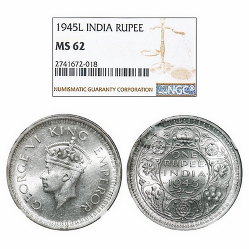 George VI, Half Silver, Rupee, 1945, Lahore Mint, D/II, 'L' raised, Security edge, Normal '5' / Thick 'L'. GK 1288. NGC Slabbed MS 62. Very scarce. |