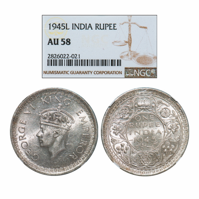 George VI, Half Silver, Rupee, 1945, Lahore Mint, D/II, 'L' raised, Security edge, Normal '5' / Thick 'L'. GK 1288. NGC Slabbed AU 58. Scarce. |
