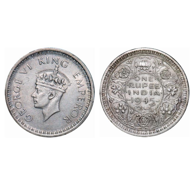 George VI, Half Silver, Rupee, 1945, Lahore Mint, D/II, 'L' raised, Security edge, Normal '5' / Thi...