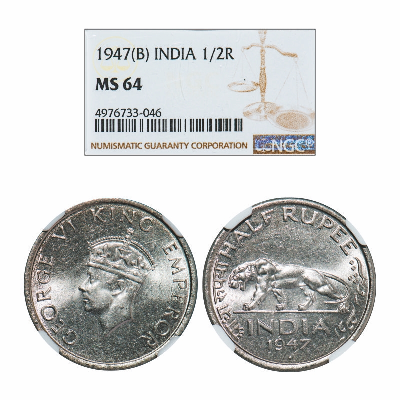 George VI, Nickel, Half Rupee, 1947, Bombay Mint, Head Type II, C/IV, Diamond mint Mark, Milled edge. GK 1322. NGC Slabbed MS 64. Rare. |