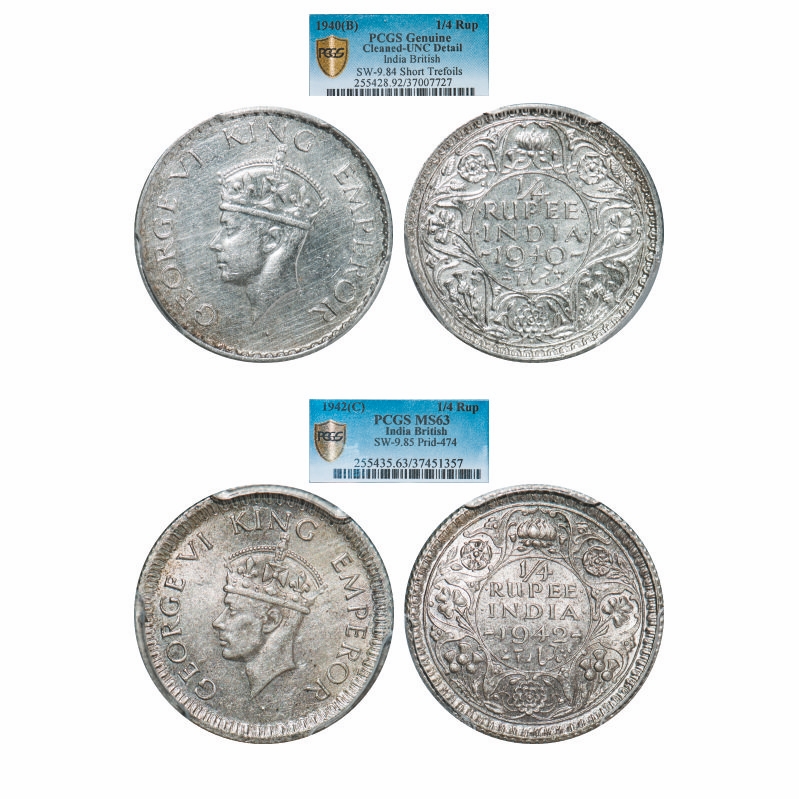 George VI, Half Silver, 1/4 Rupee, (2 slabs), 1) 1940, Bombay Mint, Head Type II, Rev I, Dot, Milled edge, 2) 1942, Calcutta Mint, Head Type II, Rev II, No dot, Milled edge. GK 1327, 1329. PCGS Slabbed UNC Details & MS 63. Scarce. |