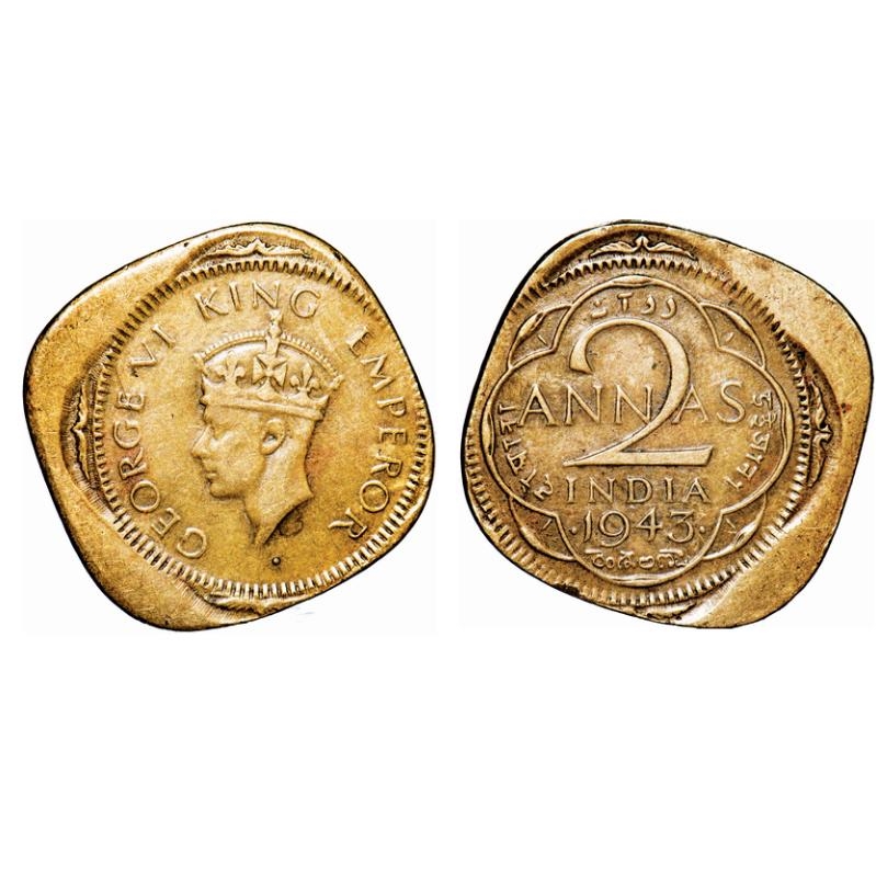 George VI, Brass-Nickel, 2 Annas, 1943, Bombay Mint, Head Type II, Dots by year, Error, 20% Misaligned Die. Very Fine+. Rare. |