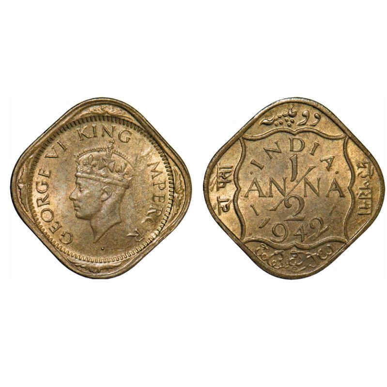 George VI, Brass-Nickel, 1/2 Anna, 1942, Bombay Mint, Dots by India dashes by year, Error, Struck through error by foreign object on Obv. Brilliant Uncirculated. Rare.