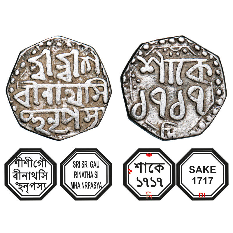 | Assam, Octagonal Silver Quarter Rupee, 2.81g, Gaurinatha Simha (1780-95), Sk. 1717 / Di (small), Assamese legends in three lines, Obv: Sri Sri Gau/rinatha Si/mha Nrpasya, Rev: in two lines, Sake 1716, with 'Di' (with short 'i') (Dichoi Mint) below. Reverse die perfectly struck at 6 o'clock. (A.Mitra 427. RB. R117.1). Very Fine, Very Scarce. |