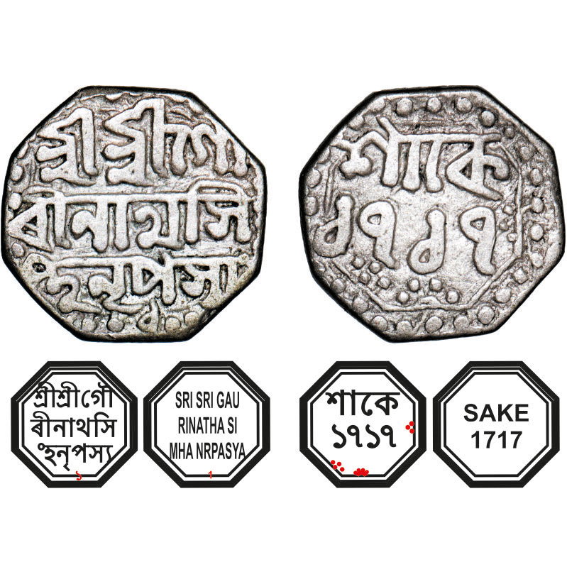 | Assam, Octagonal Silver Quarter Rupee, 2.83g, Gaurinatha Simha (1780-95), Sk. year 1 on obverse & 1717 on reverse, Assamese legends in three lines, Obv: Sri Sri Gau/rinatha Si/mha Nrpasya (year) 1, Rev: in two lines, Sake 1717. Reverse die perfectly struck at 6 o'clock. (A.Mitra. 426. RB. R121.1). Very Fine+, Scarce. |