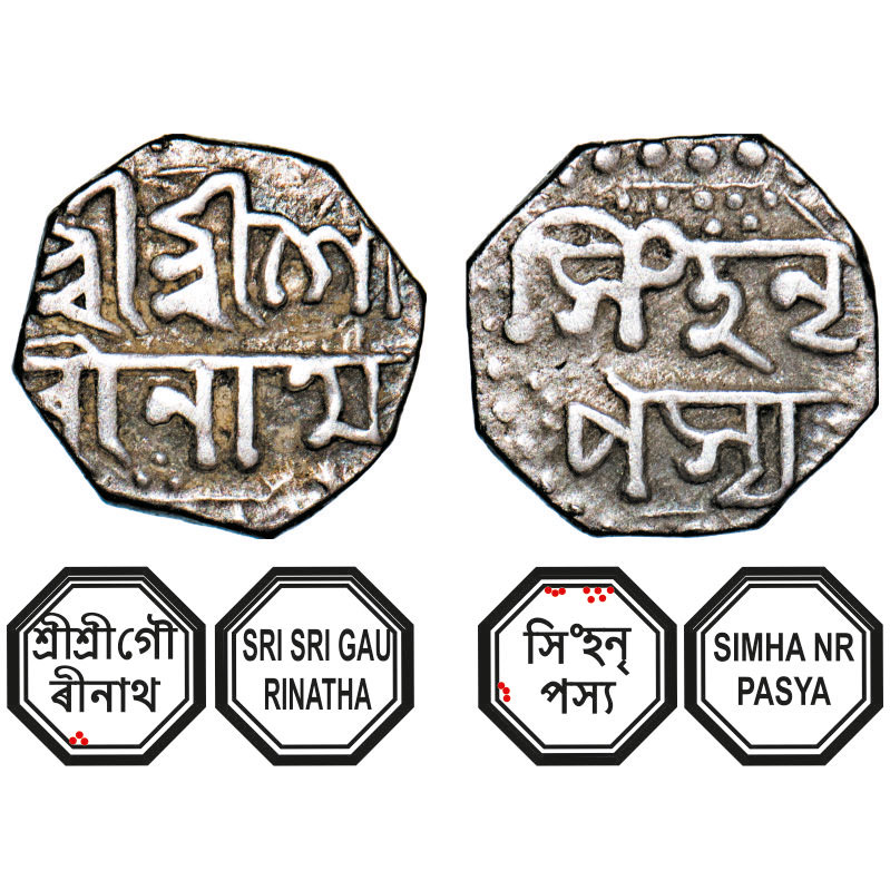 | Assam, Octagonal Silver 1/8 Rupee, 1.38g, Gaurinatha Simha (1780-95), undated, Assamese legends in two lines, Obv: Sri Sri Gau/rinatha, Rev: Simha Nr/pasya. Reverse die perfectly struck at 6 o'clock. (A.Mitra 428. RB. R124.1 type unlisted). Very Fine, Very Scarce. |
