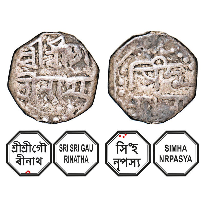 | Assam, Octagonal Silver 1/8 Rupee, 1.36g, Gaurinatha Simha (1780-95), undated, Assamese legends in two lines, Obv: Sri Sri Gau/rinatha, Rev: Simha/ Nrpasya. Reverse die perfectly struck at 6 o'clock. (A.Mitra 430B. RB. R126 type). Ex mount, Fine+, Very Scarce. |