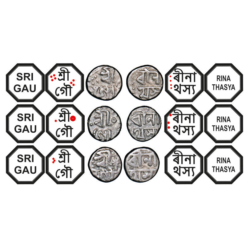 | Assam, Octagonal/circular Silver 1/32 Rupee (3 Coins), 0.35g, Gaurinatha Simha (1780-95), undated, Assamese legends in two lines, Obv: Sri Gau, Rev: rina/ thasya (3). Reverse die perfectly struck at 6 o'clock. (A.Mitra 435 types. RB. R132 types). Very Fine, Very Scarce. |