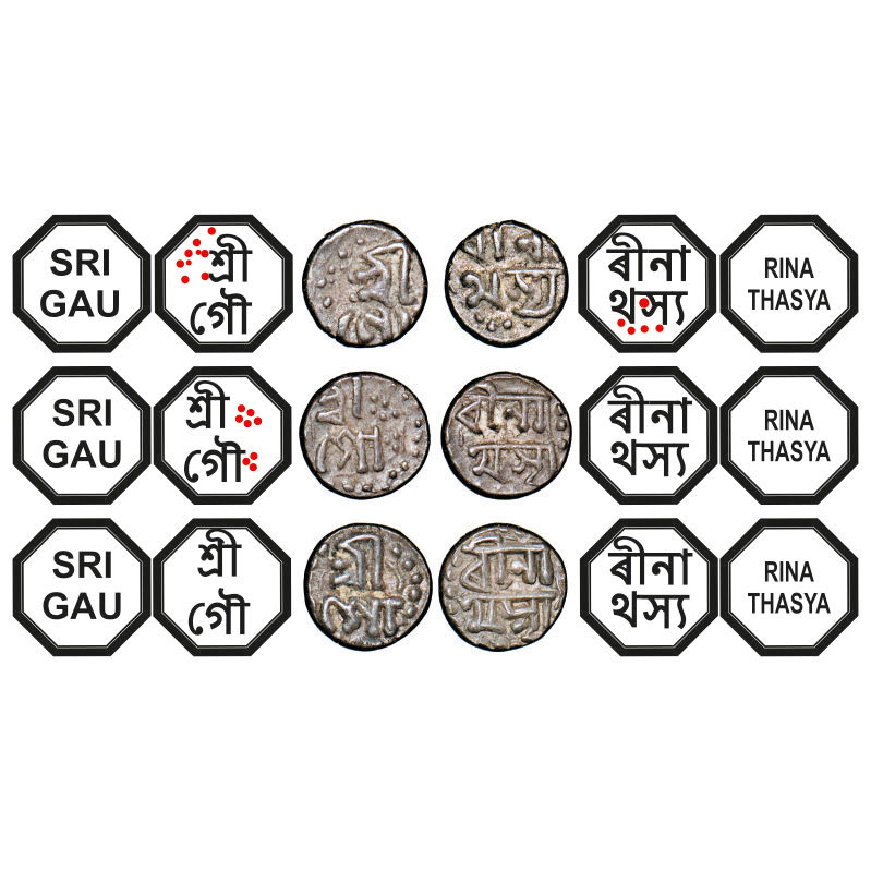 | Assam, Octagonal/circular Silver 1/32 Rupee (3 Coins), 0.35g, Gaurinatha Simha (1780-95), undated, Assamese legends in two lines, Obv: Sri Gau, Rev: rina/ thasya (3). Reverse die perfectly struck at 6 o'clock. (A.Mitra 435 types. RB. R132 types). Very Fine, Very Scarce. |