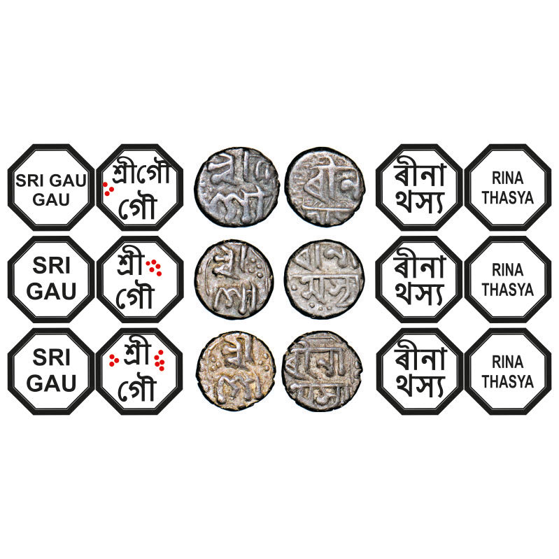 | Assam, Octagonal/circular Silver 1/32 Rupee (3 Coins), 0.35g, Gaurinatha Simha (1780-95), undated, Assamese legends in two lines, Obv: Sri Gau, Rev: rina/ thasya (3). Reverse die perfectly struck at 6 o'clock. (A.Mitra 435 types. RB. R132 types). Very Fine, Very Scarce. |
