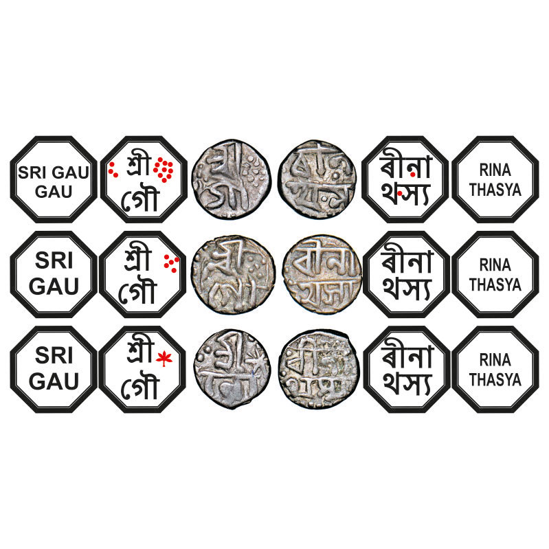| Assam, Octagonal/circular Silver 1/32 Rupee (3 Coins), 0.35g, Gaurinatha Simha (1780-95), undated, Assamese legends in two lines, Obv: Sri Gau, Rev: rina/ thasya (3). Reverse die perfectly struck at 6 o'clock. (A.Mitra 435 types. RB. R132 types). Very Fine, Very Scarce. |