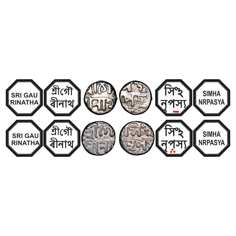 | Assam, Octagonal/circular Silver 1/32 Rupee (2 Coins), 0.30g, Gaurinatha Simha (1780-95), undated, Assamese legends in two lines, (1/16 rupee die), Obv: Sri Gau/ rinatha, Rev: Simha/ Nrpasya. Reverse die perfectly struck at 6 o'clock. (A.Mitra 437A types. RB. R133.1 types). Very Fine, Very Scarce. |