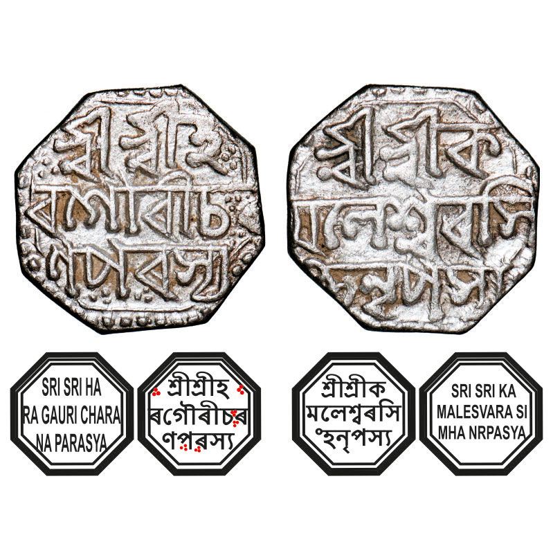 | Assam, Octagonal Silver Half Rupee, 5.62g, Kamalesvara Simha (1795-1810), undated, Assamese legends in three lines, with invocation to Siva & Parvati, Obv: Sri Sri Ha/ra Gauri Chara/na Parasya, Rev: Sri Sri Ka/malesvara Si/mha Nrpasya. Reverse die perfectly struck at 6 o'clock. (A.Mitra 441. RB. S6.1). Very Fine, Very Rare. |