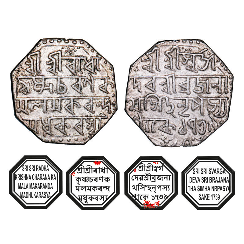 | Assam, Octagonal Silver Rupee, 10.94g, Brajnatha Simha (1817/18-1819), Sk. 1739, Assamese legends in four lines, with invocation to Radha and Krishna, Obv: Sri Sri Radha/ Krishna Charana Ka/mala Makaranda/ Madhukarasya, Rev: Sri Sri Svarga/ Deva Sri Brajana/tha Simha/ Nrpasya / Sake 1740, lion running left, below. Reverse die perfectly struck at 6 o'clock. (A.Mitra. 449, RB. T 8.4 type unlisted). Almost Mint State, Very Rare. |