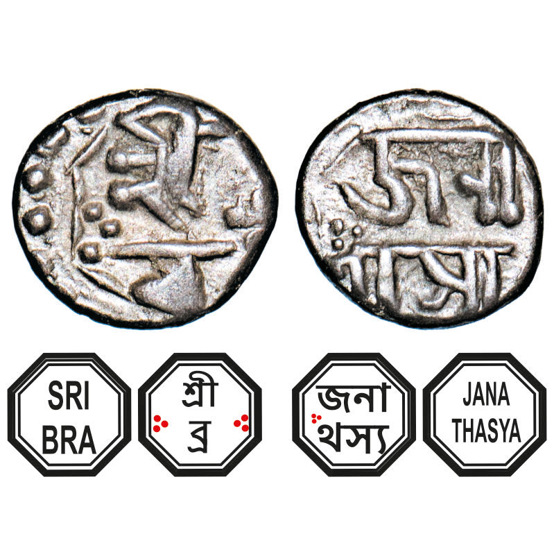 | Assam, Octagonal Silver 1/32 Rupee, 0.39g, Brajnatha Simha (1817/18-1819), undated, Assamese legends in two lines, Obv: Sri Bra, Rev: jana/thasya. Reverse die perfectly struck at 6 o'clock. (A.Mitra. 458A, RB. T 17.2 type). Extremely Fine, Rare. |