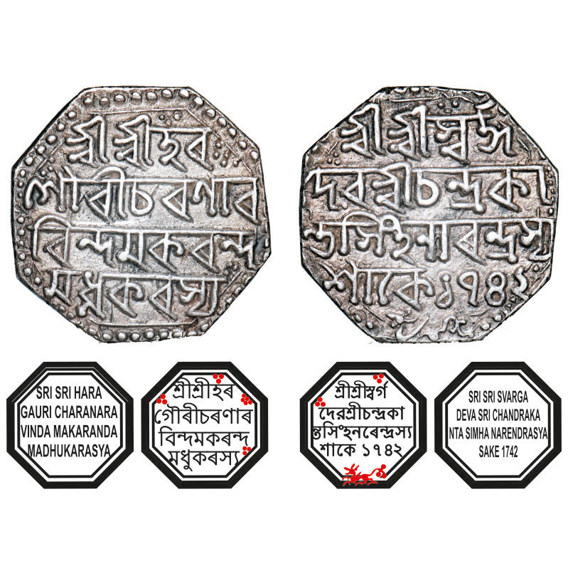 | Assam, Octagonal Silver Rupee, 11.21g, Chandrakanta Simha (1819-1821), Sk. 1742, Assamese legends in four lines, with invocation to Shiva and Parvati, Obv: Sri Sri Hara/ Gauri Charanara/vinda Makaranda/ Madhukarasya, Rev: Sri Sri Svarga/ Deva Sri Chandraka/nta Simha Narendrasya / Sake 1742, lion running left, below. Reverse die perfectly struck at 6 o'clock. Ex Nicholas Rhodes collection. (A.Mitra. 465, RB. U 8.2). Toned, Almost Extremely Fine, Very Rare. |