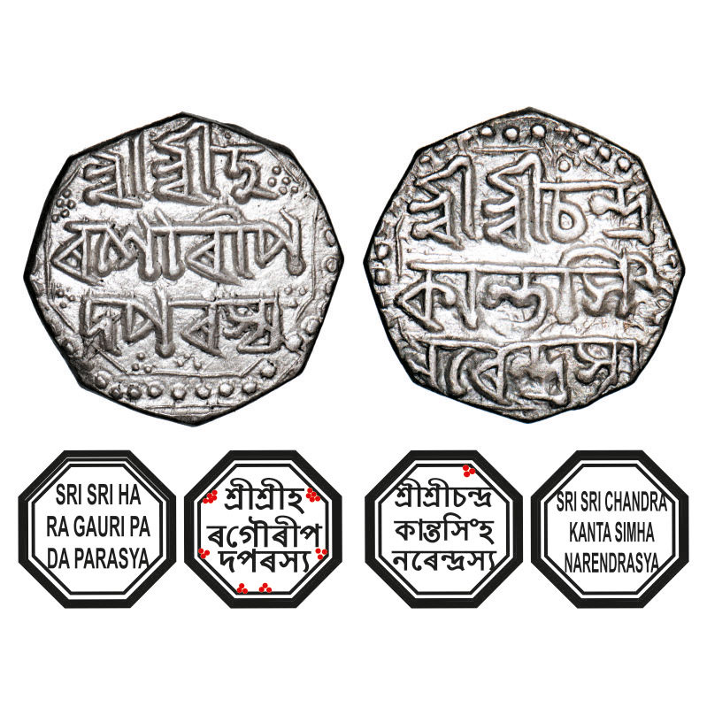 | Assam, Octagonal Silver Half Rupee, 5.63g, Chandrakanta Simha (1819-1821), undated, Assamese legends in three lines, with invocation to Shiva and Parvati, Obv: Sri Sri Ha/ra Gauri Pa/da Parasya, Rev: Sri Sri Chandra/kanta Simha/ Narendrasya. Reverse die perfectly struck at 6 o'clock. (A.Mitra. 467, RB. U 10.1 unlisted type). Toned Uncirculated, Very Rare. |