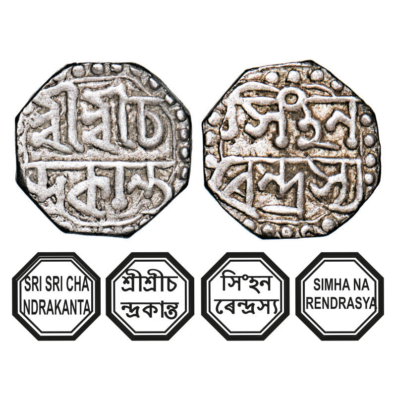 | Assam, Octagonal Silver 1/8 Rupee, 1.39g, Chandrakanta Simha (1819-1821), undated, Assamese legends in two lines, Obv: Sri Sri Cha/ndrakanta, Rev: Simha Na/rendrasya. Reverse die perfectly struck at 6 o'clock. (A.Mitra. 470, RB. U 13.1 type). Very Fine, Very Rare. |