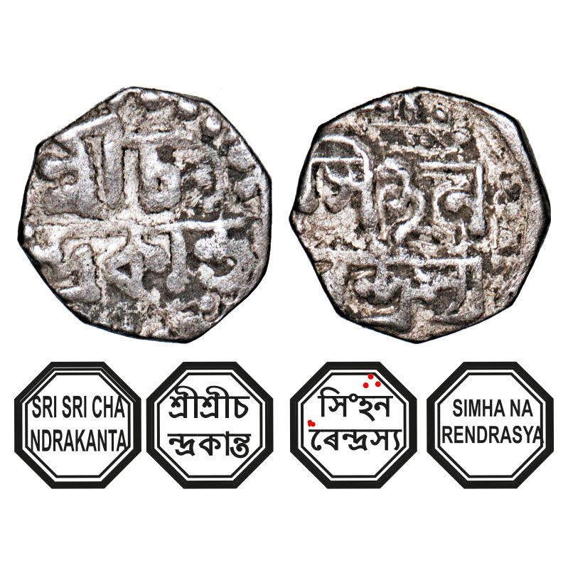 | Assam, Octagonal Silver 1/16 Rupee, 0.71g, Chandrakanta Simha (1819-1821), undated, Assamese legends in two lines, Obv: Sri Cha/ndrakanta, Rev: Simha Na/rendrasya. Reverse die perfectly struck at 6 o'clock. Ex Nicholas Rhodes collection. (A.Mitra. 471, RB. U 14.1 type). About Very Fine, Very Rare. |