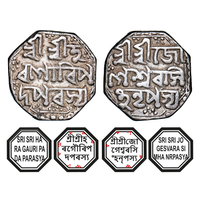 | Assam, Octagonal Silver Half Rupee, 5.61g, Jogesvara Simha (1821-24), undated, Assamese legends in three lines, with invocation to Shiva and Parvati, Obv: Sri Sri Ha/ra Gauri (short 'i') Pa/da Parasya, Rev: Sri Sri Jo/gesvara Si/mha Nrpasya. Reverse die perfectly struck at 6 o'clock. Ex Nicholas Rhodes collection with Ticket. (A.Mitra. 478, RB. V4.1). Toned Very Fine+, Extremely Rare. |