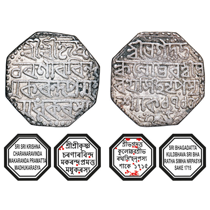 | Assam, Octagonal Silver Rupee, 10.96g, Bharatha Simha (Moamaria Rebels) (1791-1797), Sk. 1715, Assamese legends in four lines, with invocation to Krishna, Obv: Sri Sri Krishna/ Charanaravinda/ Makaranda Pramatta/ Madhukarasya, Rev: Sri Bhagadatta/ Kulodbhava Sri Bha/ratha Simha Nrpasya/ Sake 1715, lion running right, below, crescent on top left. Reverse die perfectly struck at 6 o'clock. (A.Mitra. Rebel 10A, RB. W 8.2). Very Fine+, Very Rare. |