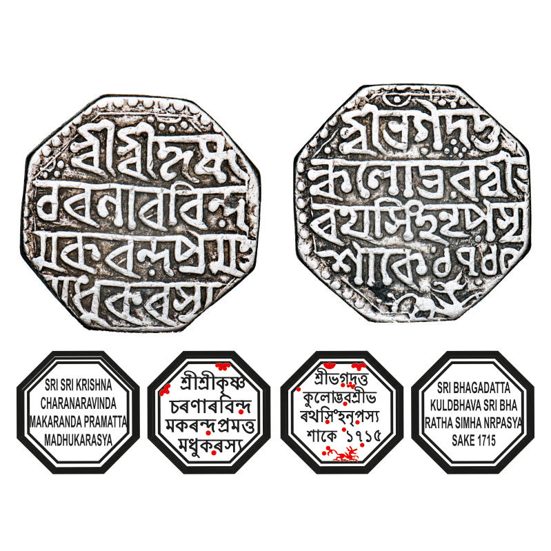 | Assam, Octagonal Silver Rupee, 11.26g, Bharatha Simha (Moamaria Rebels) (1791-1797), Sk. 1715, Assamese legends in four lines, with invocation to Krishna, Obv: Sri Sri Krishna/ Charanaravinda/ Makaranda Pramatta/ Madhukarasya, Rev: Sri Bhagadatta/ Kulodbhava Sri Bha/ratha Simha Nrpasya/ Sake 1715, lion running right, below, crescent on top left. Reverse die perfectly struck at 6 o'clock. (A.Mitra. Rebel 10, RB. W 8.5 type). Very Fine, Very Rare. |