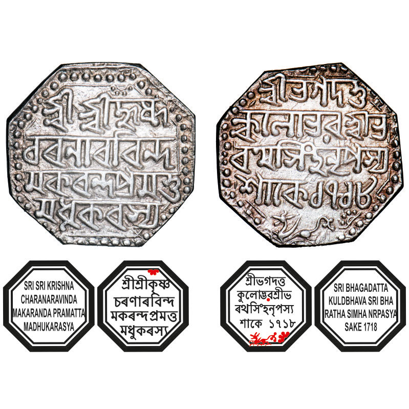 | Assam, Octagonal Silver Rupee, 11.31g, Bharatha Simha (Moamaria Rebels) (1791-1797), Sk. 1718, Assamese legends in four lines, with invocation to Krishna, Obv: Sri Sri Krishna/ Charanaravinda/ Makaranda Pramatta/ Madhukarasya, Rev: Sri Bhagadatta/ Kulodbhava Sri Bha/ratha Simha Nrpasya/ Sake 1718, lion running left, below. Reverse die perfectly struck at 6 o'clock. (A.Mitra. Rebel 12, RB. W 9.2). Uncirculated, Very Rare. |