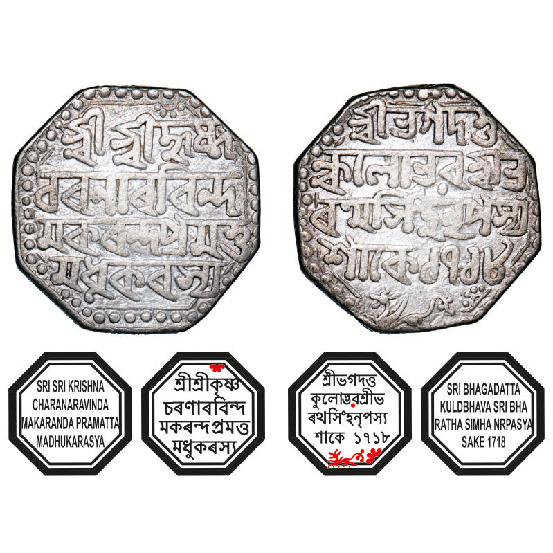 | Assam, Octagonal Silver Rupee, 11.28g, Bharatha Simha (Moamaria Rebels) (1791-1797), Sk. 1718, Assamese legends in four lines, with invocation to Krishna, Obv: Sri Sri Krishna/ Charanaravinda/ Makaranda Pramatta/ Madhukarasya, Rev: Sri Bhagadatta/ Kulodbhava Sri Bha/ratha Simha Nrpasya/ Sake 1718, lion running left, below. Reverse die perfectly struck at 6 o'clock. (A.Mitra. Rebel 12A, RB. W 9.2 type). Toned Very Fine, Very Rare. |